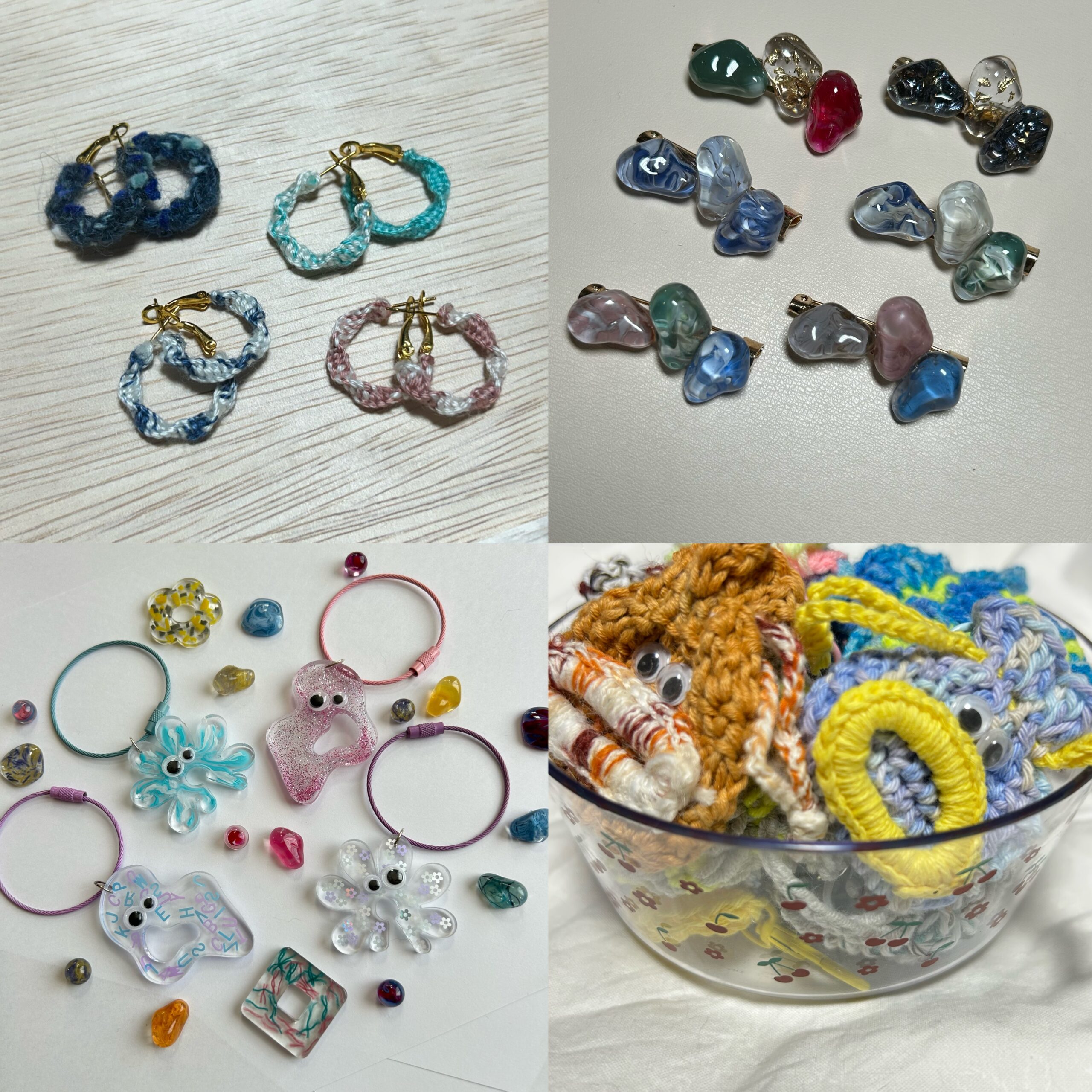 ニットの作品を作って出た端材をレジンに閉じ込めて、カワイイおもちゃ、カワイイアクセサリーを作ってます☺︎会場でお待ちしています!!